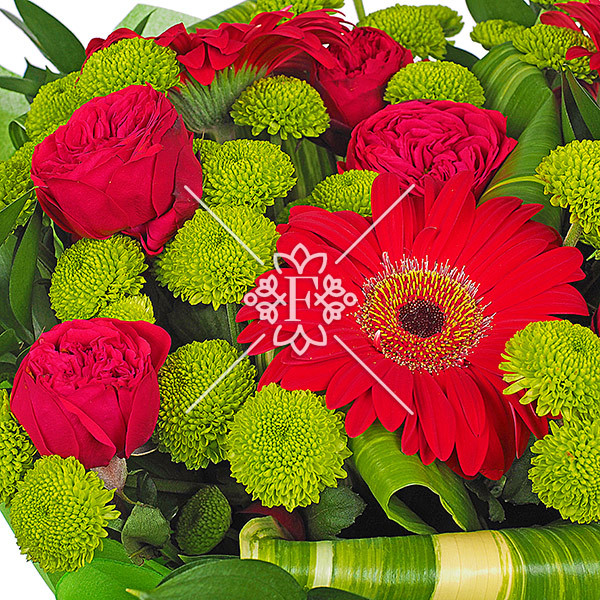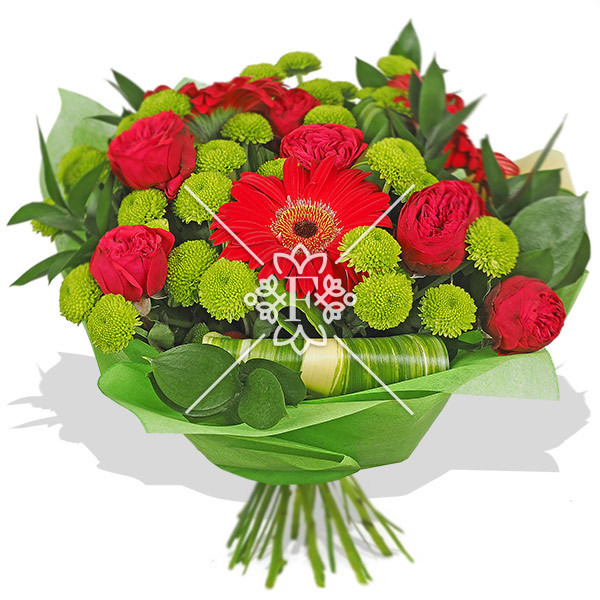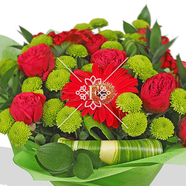 роза красная кустовая - 2 шт., гербера красная - 1 шт, хризантема кустовая зеленая - 2 шт., декоративная зелень (лист аспидистры загнутый, рускус), упаковка, зелень.